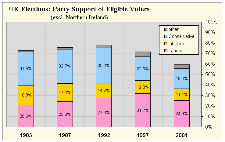 British election results: percent support of eligible voters by party | |||||