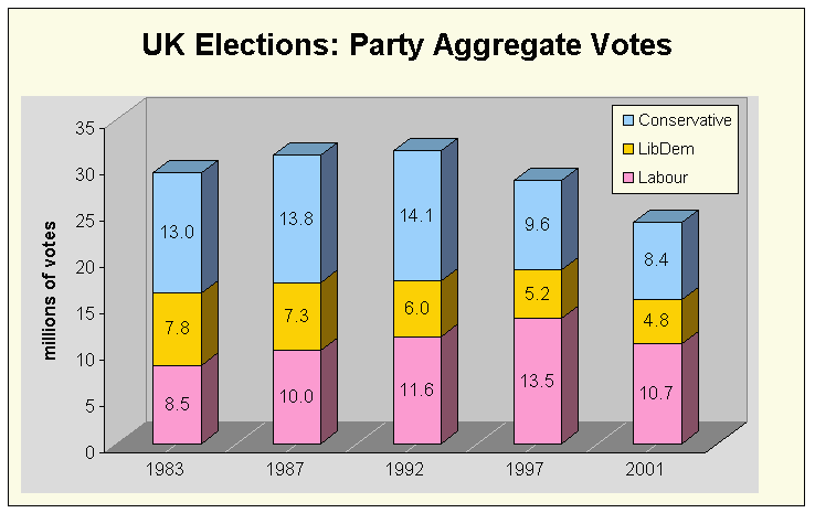The actual results, shown below (and in this graph), show that Labour was only marginally more popular in 2001 than in 1987 when Margaret Thatcher ruled the roost. In 1987, the margin between Labour and the winning Conservatives was 11.5%. In other words, with essentially the same vote in 1987, Labour was at the losing end of a bigger landslide than the hapless Tories were in 2001. In 1992, Labour got more votes than in 2001, despite suffering a massive defeat.